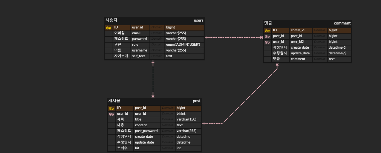 | 댓글 수정 | Put | /posts/{post_id}/comments/{id} | UserDetailsImpl userDetails(유저 정보), @RequestBody CommentRequestDto requestDto(댓글 정보), @PathVariable Long post_id(게시글id) | 성공여부 메세지 반환, 댓글을 Client로 반환 |