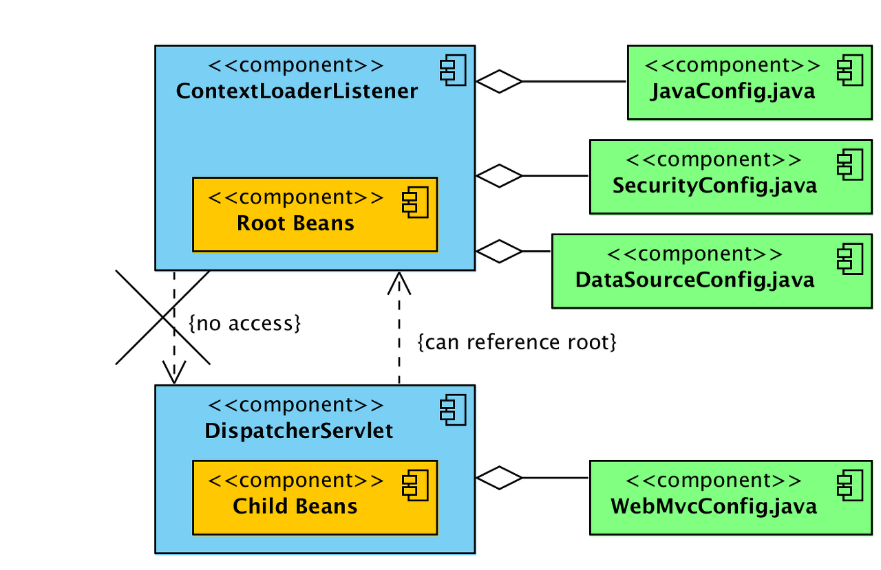 - 일반적으로, Spring MVC 관련 컴포넌트는 DispatcherServlet의 ApplicationContext 인터페이스에서 초기화되고, 나머지는 ContextLoaderListener에 의해 로드된다.
