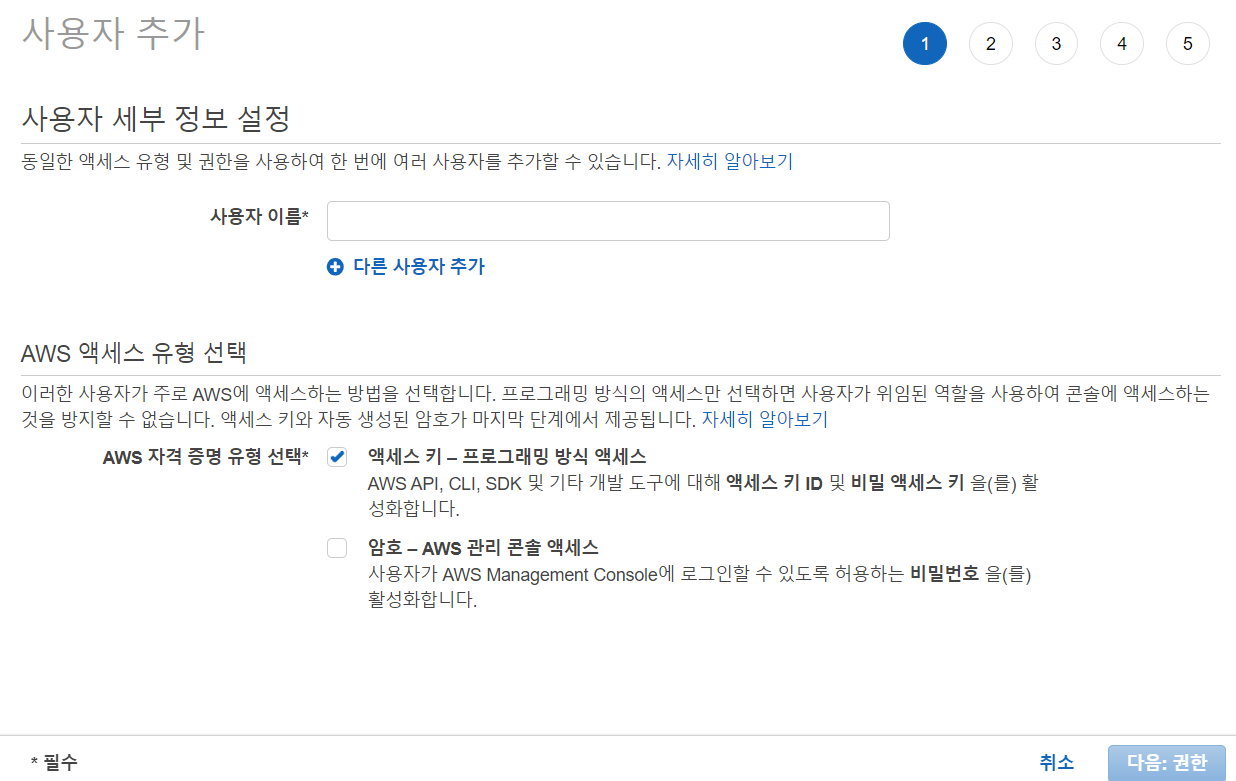 설정후에 사용자 추가를 하면 액세스 키, 비밀 엑세스 키가 보여지는데 이 키들은 현재 화면에서 밖에 볼 수 없다. 즉, .csv 파일을 다운받아 로컬에 꼭 가지고 있어야 한다. 꼭 무조건,,,,