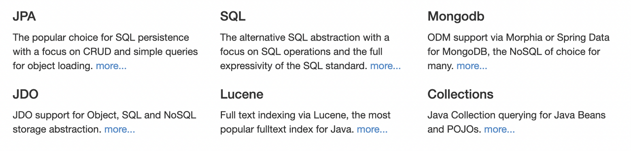 공식 사이트 를 보면 JPA 뿐만 아니라 SQL, Mongodb, Lucenece 등 다양한 언어에 대해서 서비스를 제공한다.