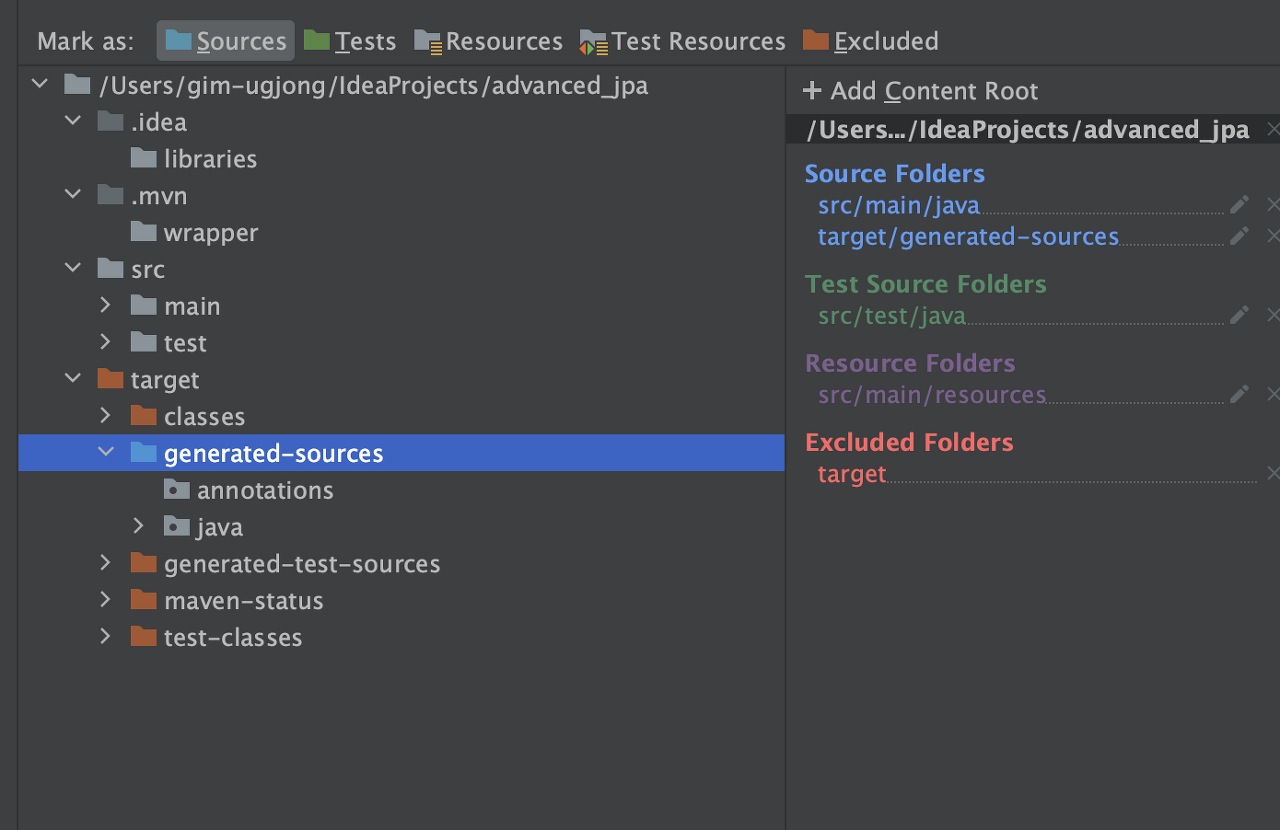 generated-sources를 Mark as Sources로 하여 IDE에서 소스 파일로 인식할 수 있게 해주어야 함