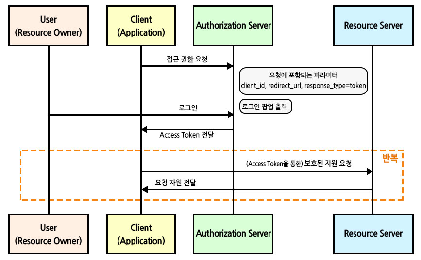 자격 증명을 안전하게 저장하기 힘든 클라이언트 사이드에서의 OAuth2 인증에 최적화된 방식으로 response_type=token의 형식으로 요청됩니다.