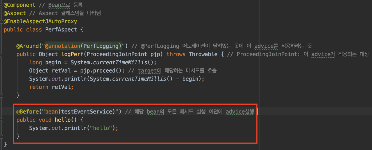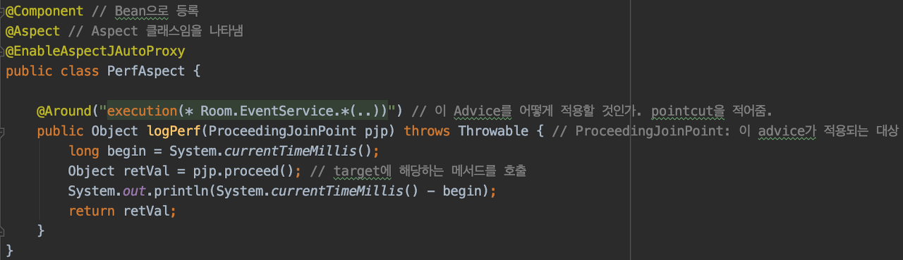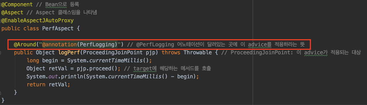 public Object logPerf 자체가 하나의 advice이며, 이 advice가 어디에 적용될 것 인지(pointcut) @Around 어노테이션으로 표시해준다.