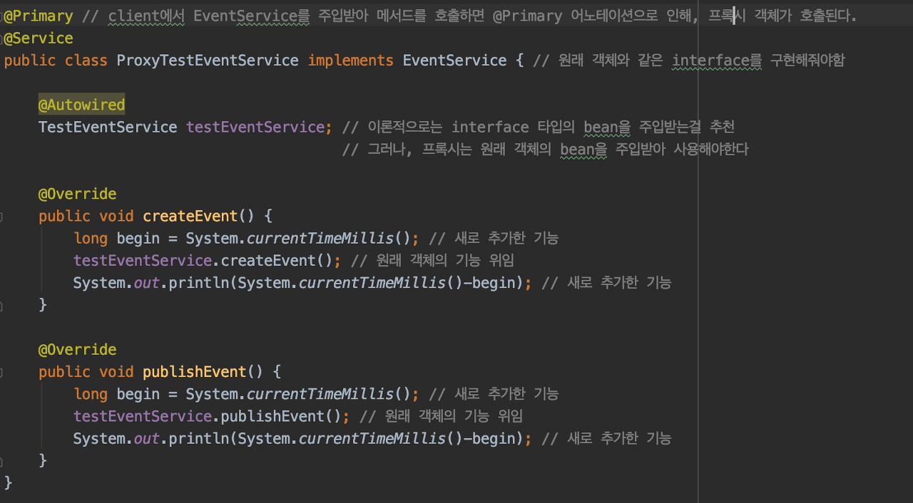 이 코드를 실행시키는 main이 client라고 볼 수 있고, TestEventService가 원래 객체로 볼 수 있다.