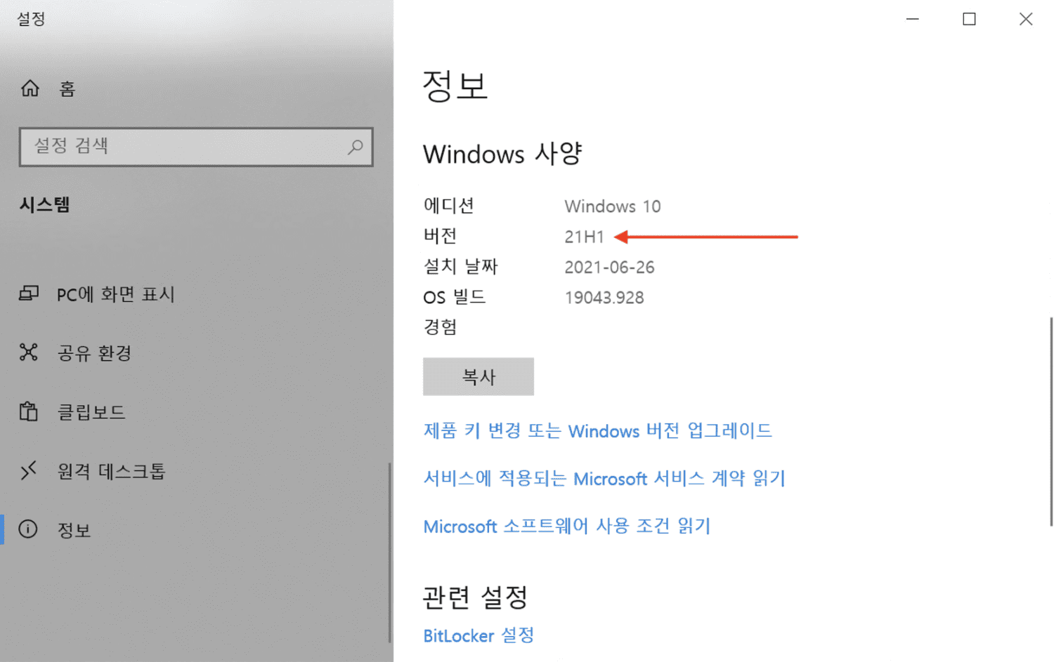 오른쪽 정보 페이지에서 스크롤을 내리면 Windows 사양을 확인할 수 있습니다. 여기서 버전이 20H1, 20H2, 21H1 혹은 그보다 높은 버전인지 확인합니다.