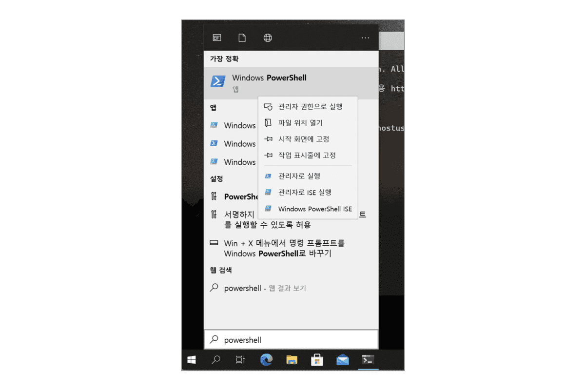 PowerShell을 검색해서 관리자 권한으로 실행합니다
