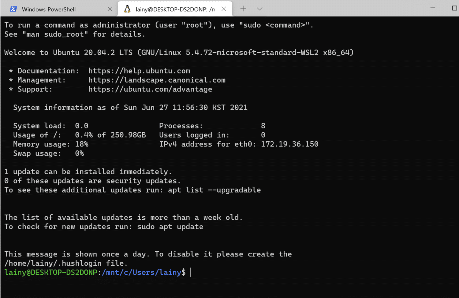 이 내용을 자세히 보면 디렉터리가 /mnt/c/Users/lainy로 실행됩니다. 즉, Windows 10 메인 디스크가 리눅스와 연결되어있으며, WSL2 Linux에서 Windows의 파일을 사용하는 것도 가능합니다.