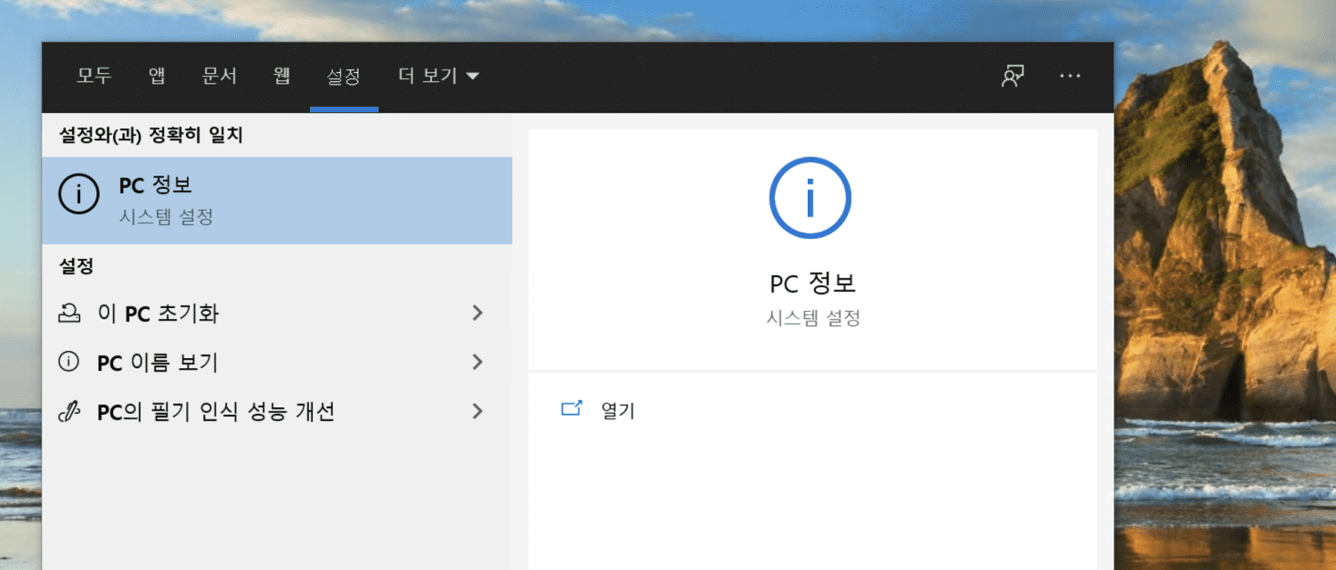 설치 전에 먼저 Windows + S 키를 클릭하고 PC 정보(설정)를 검색해서 실행합니다.