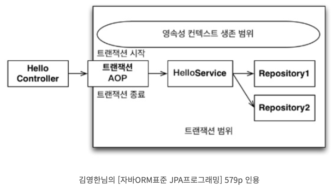 또한, 스프링 컨테이너는 트랜잭션 범위의 영속성 컨텍스트 전략을 기본으로 사용한다. 서비스 클래스에서 @Transactional을 사용할 경우, 해당 코드 내의 메서드를 호출할 때 영속성 컨텍스트가 생긴다는 뜻이다. 영속성 컨텍스트는 트랜잭션 AOP가 트랜잭션을 시작할 때 생겨나고, 메서드가 종료되어 트랜잭션 AOP가 트랜잭션을 커밋할 경우 영속성 컨텍스트가 flush되면서 해당 내용이 반영된다. 이후 영속성 컨텍스트 역시 종료되는 것이다.
