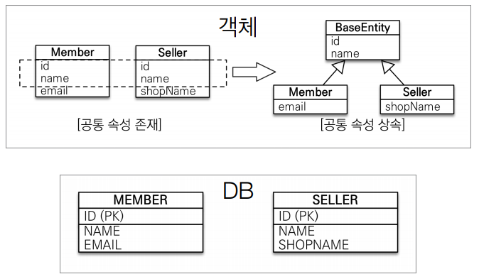 위에 코드는 BaseEntity의 id, name 두 공통 속성을 부모클래스로 모으로 객체 상속 관계로 만들었다.