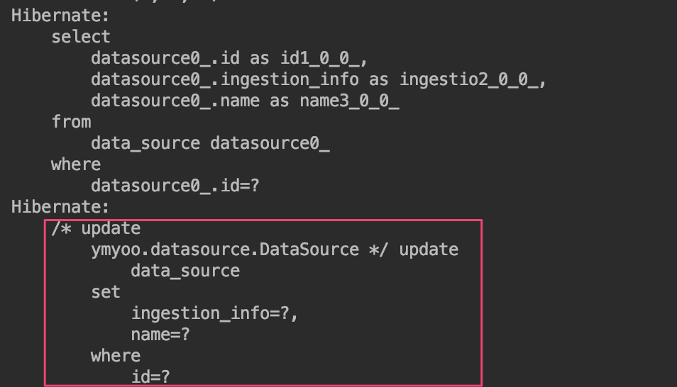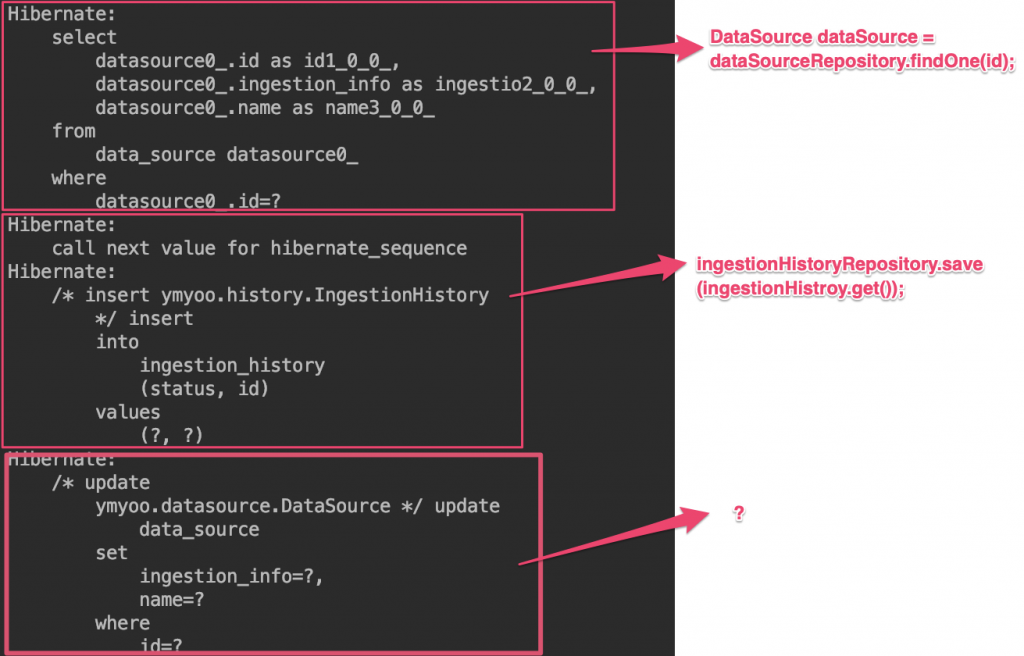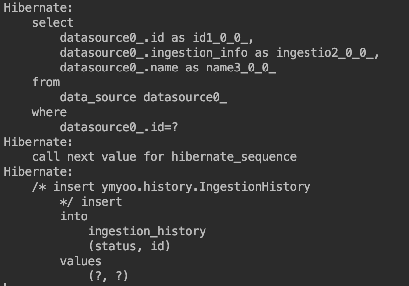 그 이유는 앞서 언급했던 것처럼 엔티티 매니저의 데이터 베이스 반영 시점이 트랜잭션을 커밋 하거나 엔티티 매니저의 flush 메소드를 호출하는 경우이기 때문이다. 위의 코드에서는 dataSource를 변경하기 이전에 이미 커밋(ingestionHistoryRepository.save) 되었다.