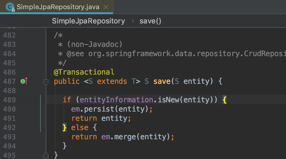 스프링 데이터 JPA에서 제공하는 JpaRepository 인터페이스의 기본 구현체는 SimpleJpaRepository이다. SimpleJpaRepository의 save 메서드에는 스프링 Transactional 어노테이션이 붙어 있다. 이 의미는 이미 트랜잭션이 중이라면 참여하고 트랜잭션이 없다면 트랜잭션을 새로 시작하라는 의미이다.