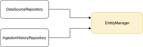 연관 관계가 없는 2개(DataSource, IngestionHistory) JPA 엔티티와 스프링 데이터 JpaRepository를 상속하여 만든 리파지토리가 있다.