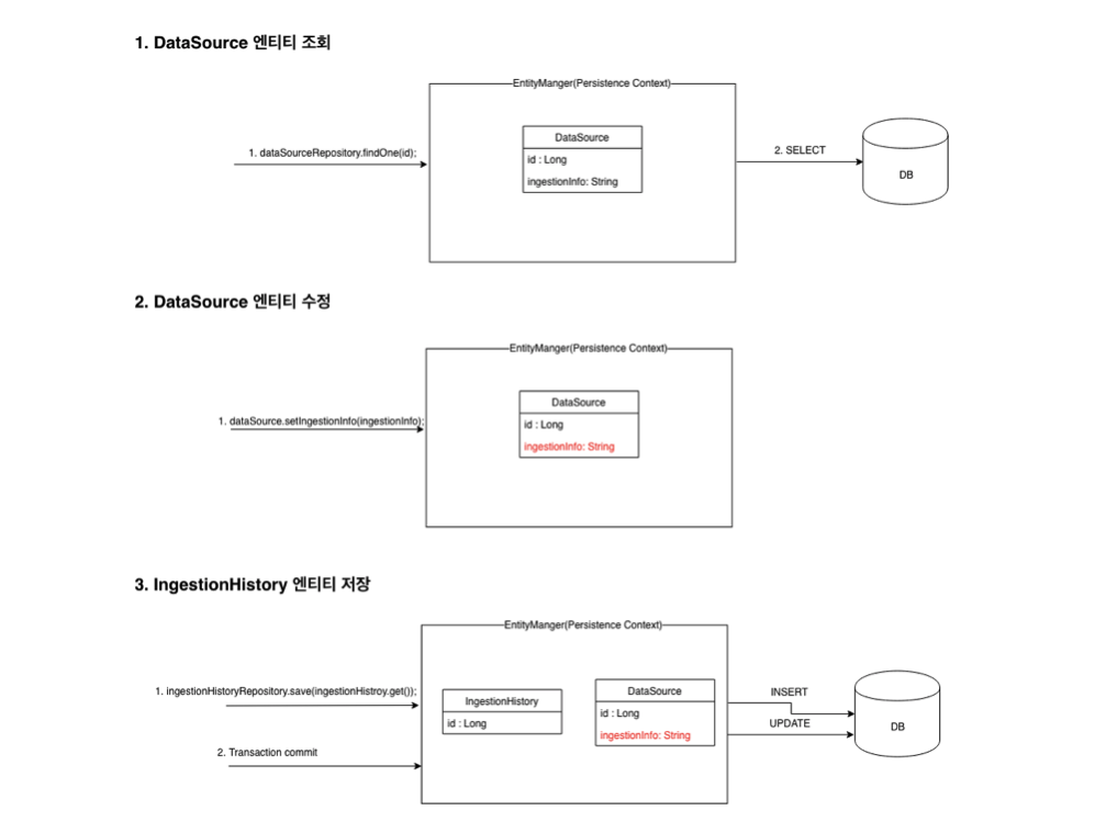 스프링 컨트롤러(DataSourceController)에서는 DataSourceRepository로 DataSource 엔티티를 조회하고 필드 값을 변경한다. 변경한 엔티티를 스프링 서비스(EngineIngestionService)로 위임하는데 서비스 내부에서는 처리 결과로 IngestionHistory를 반환할 뿐 리파지토리를 사용하지 않는다. 마지막으로 반환받은 IngestionHistory 엔티티를 IngestionHistoryRepository로 저장한다.