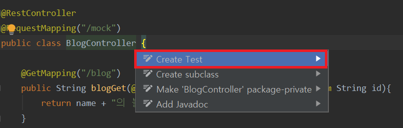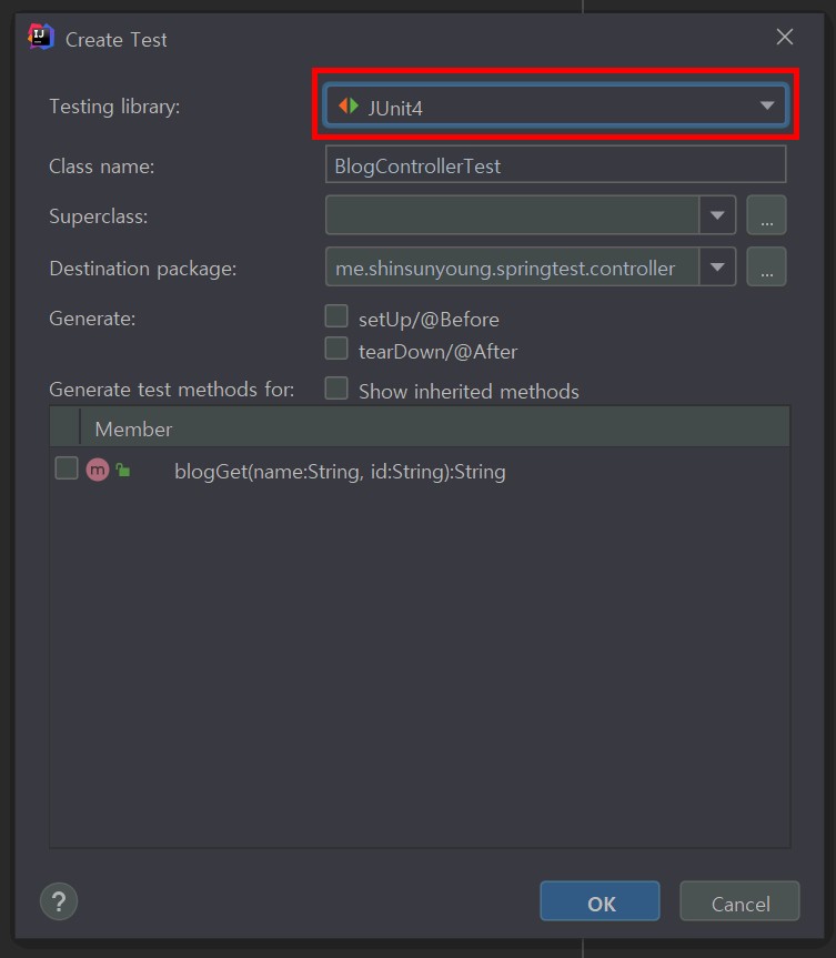 intelliJ의 경우에는 컨트롤러 이름 끝에서 Alt + Enter를 누르면 간편하게 추가할 수 있습니다. 저는 Junit4를 사용하기 때문에 Testing library를 Junit4로 지정해주었습니다.