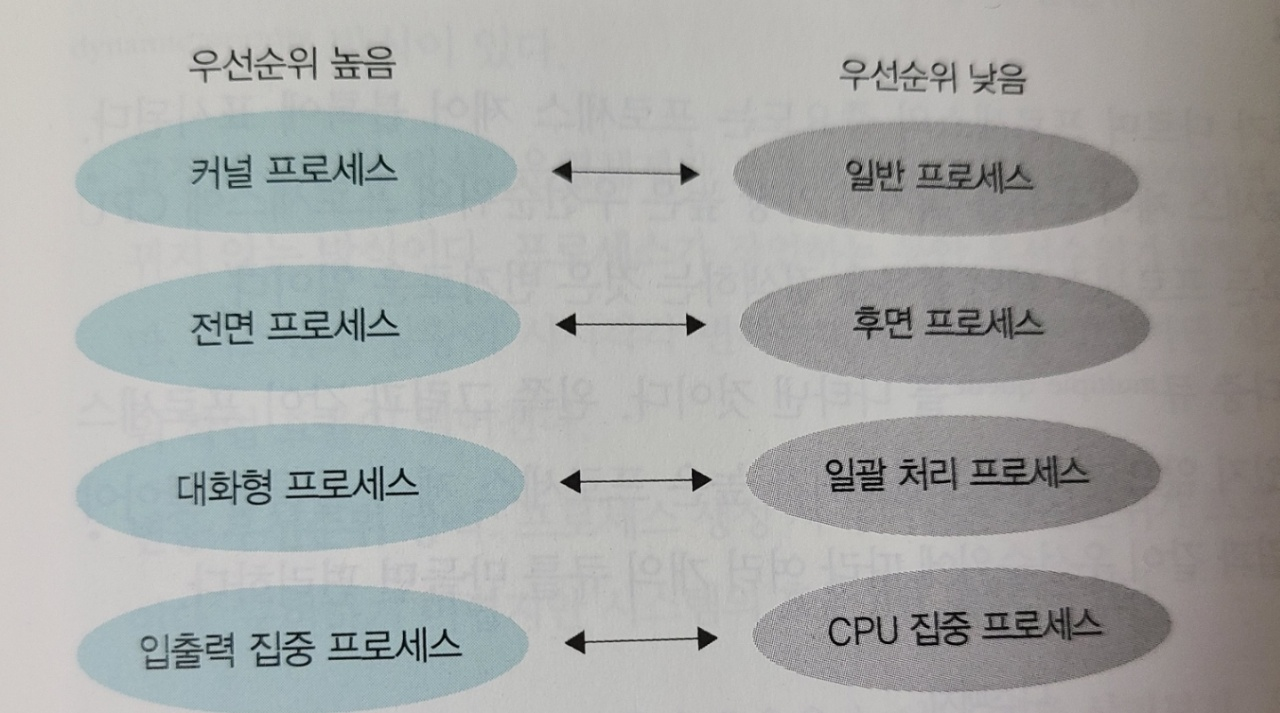 일반 프로세스 간에도 우선순위가 존재합니다. 비디오 플레이어와 워드 작업이 같은 우선순위라면 실시간으로 영상을 출력해야 하는 비디오 플레이어가 끊기고 맙니다. 이러한 문제 해결을 위해서는 일반 프로세스 간에도 우선순위를 매겨야 한다는 사실이 합리적임을 알 수 있습니다.