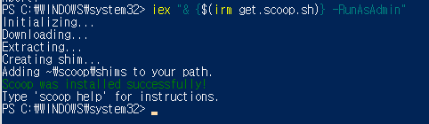 - scoop 다운로드 -> iex "& {$(irm get.scoop.sh)} -RunAsAdmin" 입력