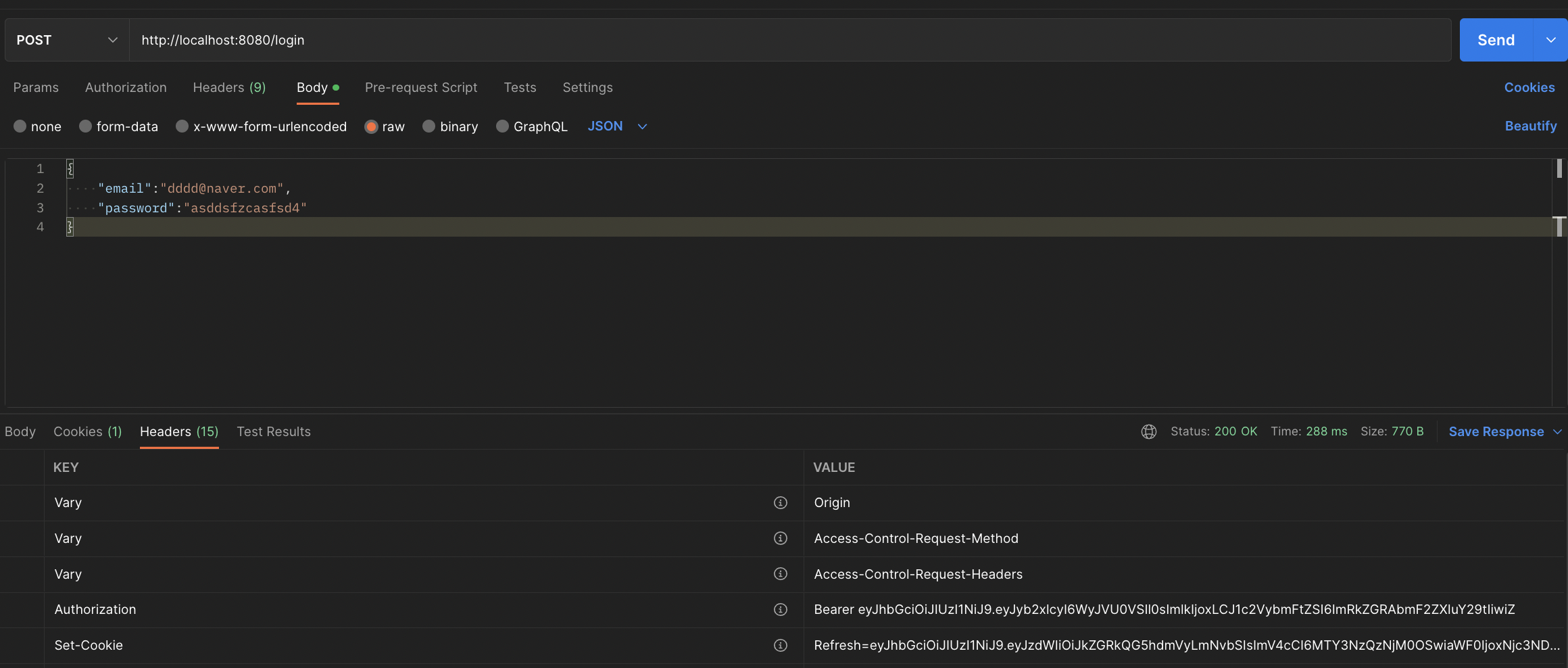 로그인 요청을 날리고, AccessToken과 RefreshToken이 정상적으로 돌아오는 것을 확인했다.
