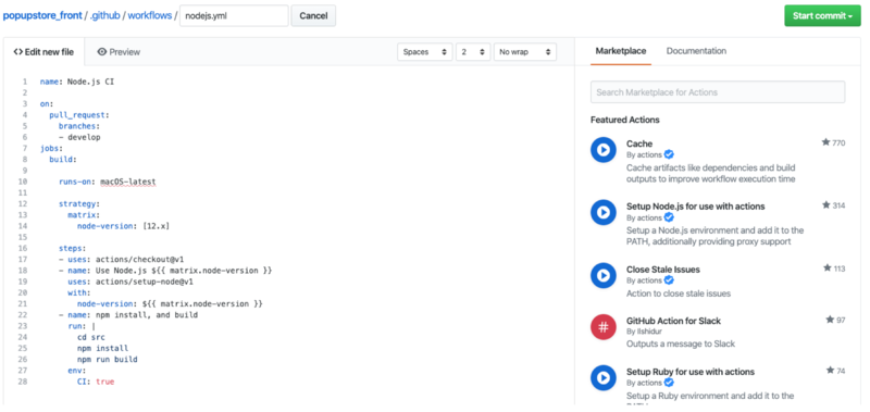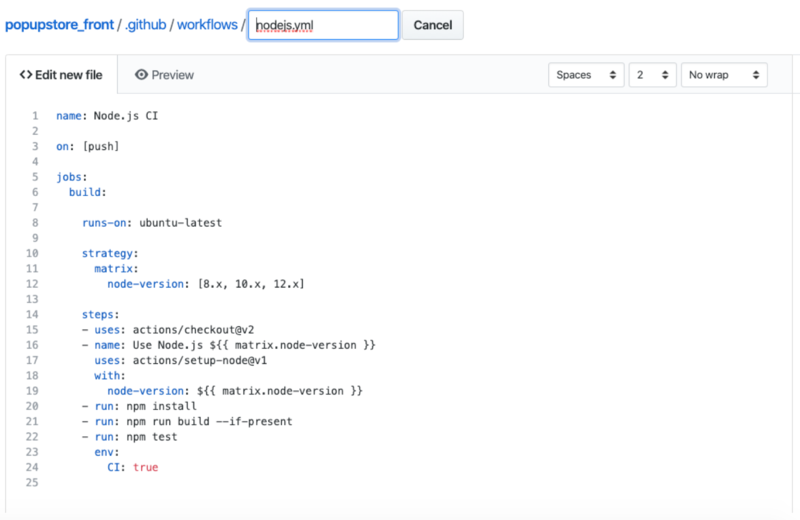 3. 그러면 nodejs.yml 파일을 작성할 수 있도록 나오는데, 여기서 우리가 원하는 행동을 정의하면 된다.