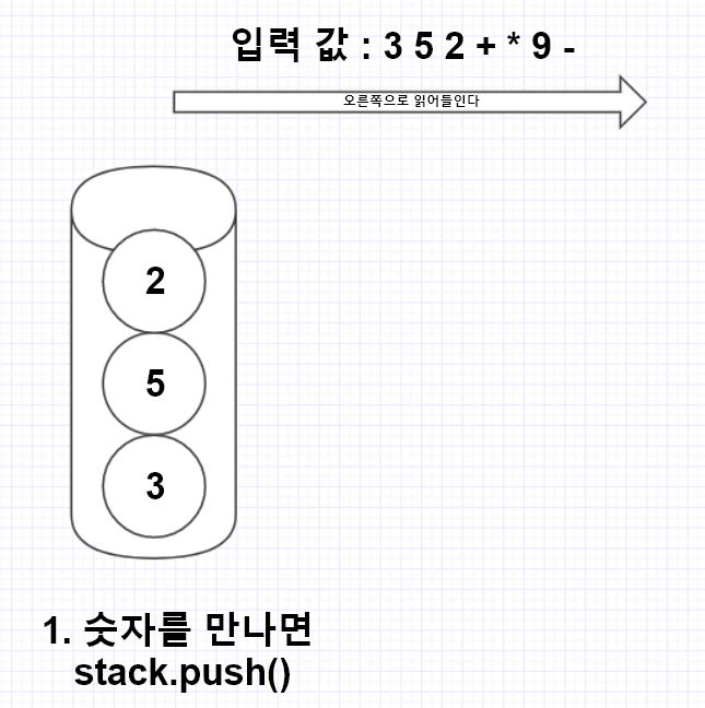 - 입력값을 읽어들인 후, 숫자가 나오면 stack에 push한다.
