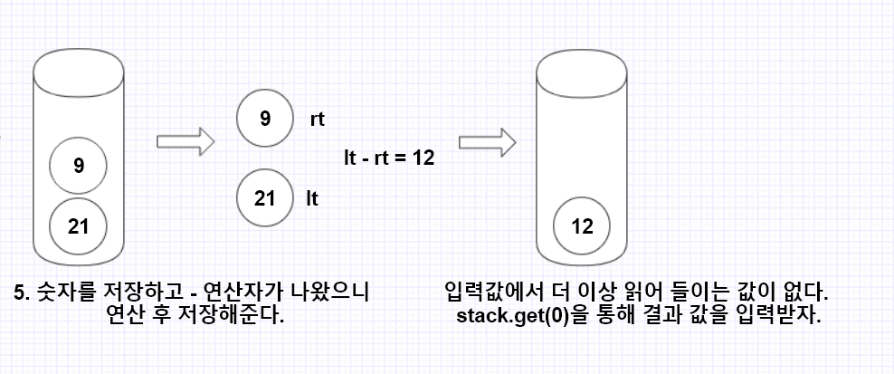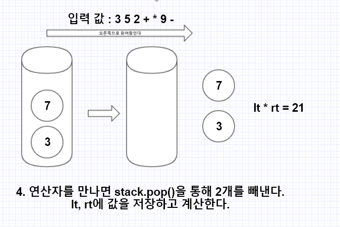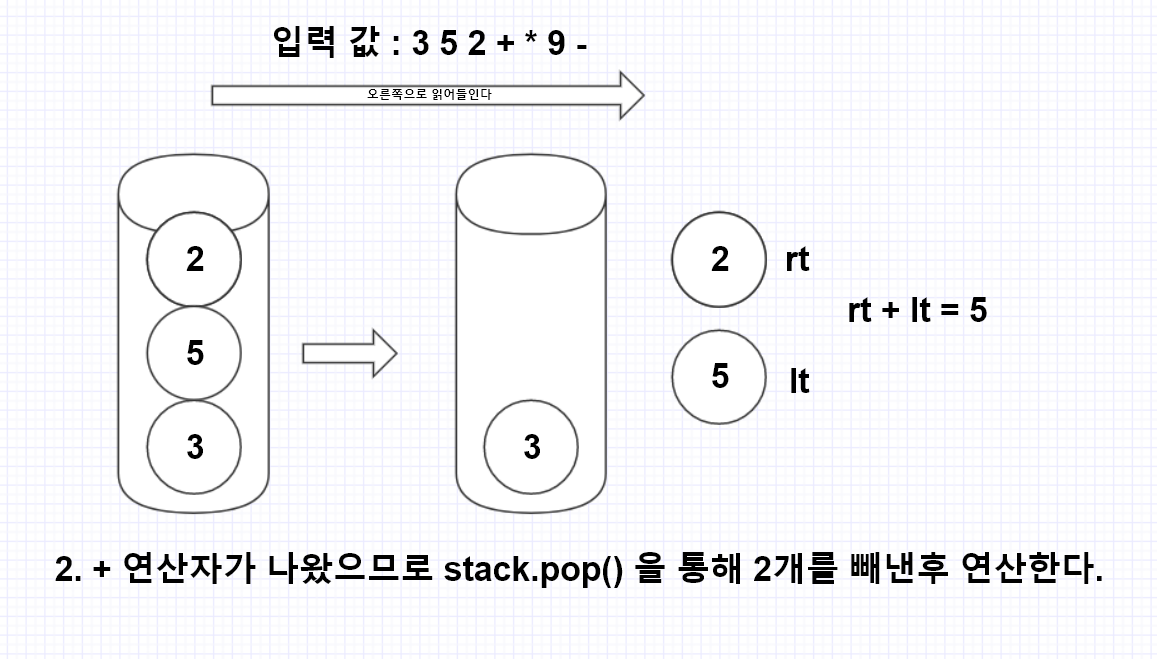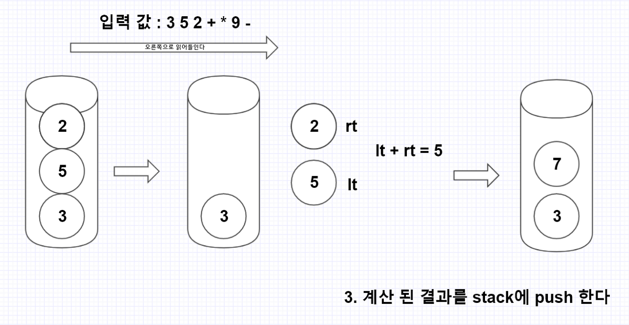 - 연산자가 나올 경우, 연산자 앞의 2개의 숫자를 계산한다.