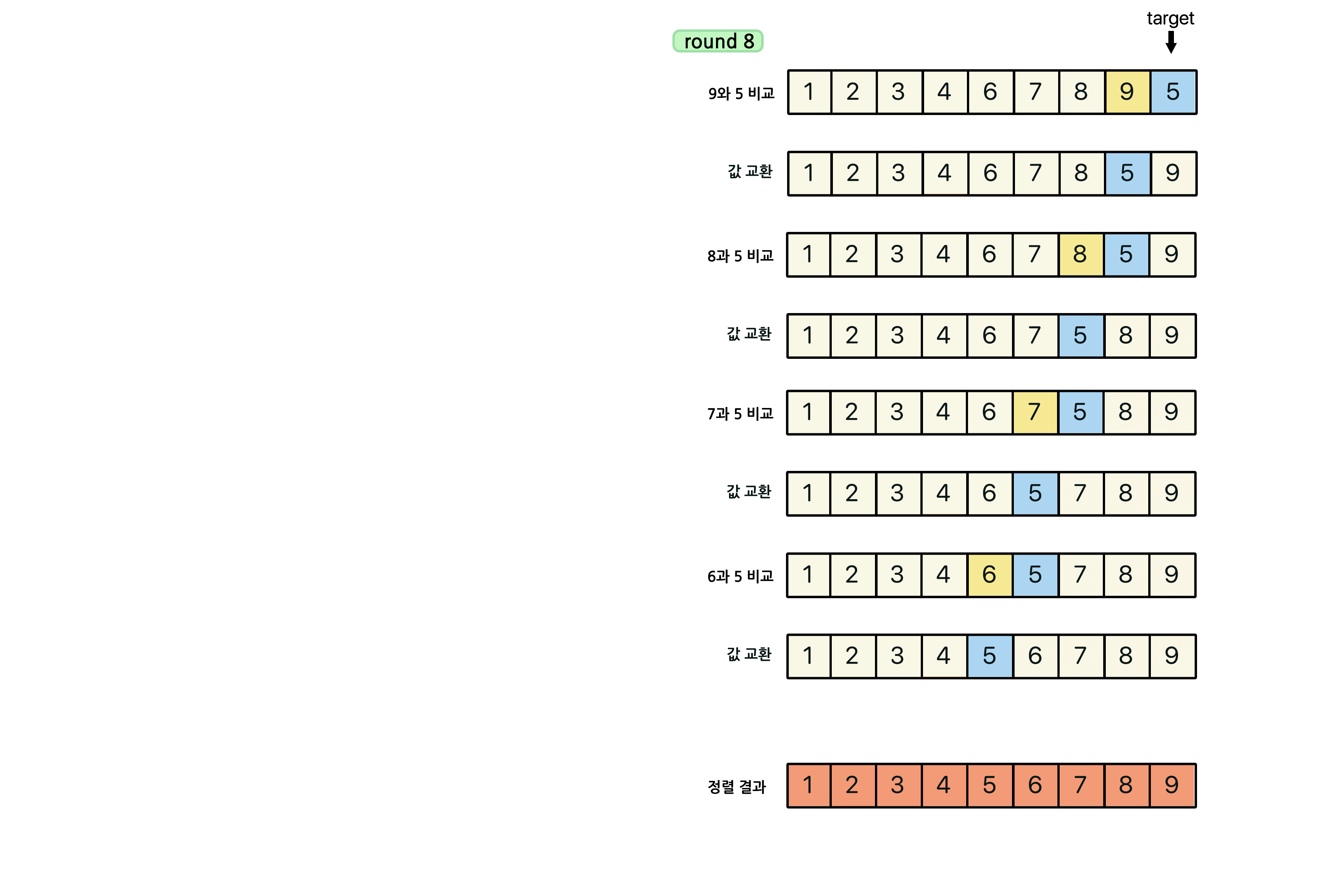 이 때, 각 라운드를 진행 할 때마다 뒤에서부터 한 개씩 정렬되기 때문에, 라운드가 진행 될 때마다 한 번씩 줄면서 비교하게 된다.