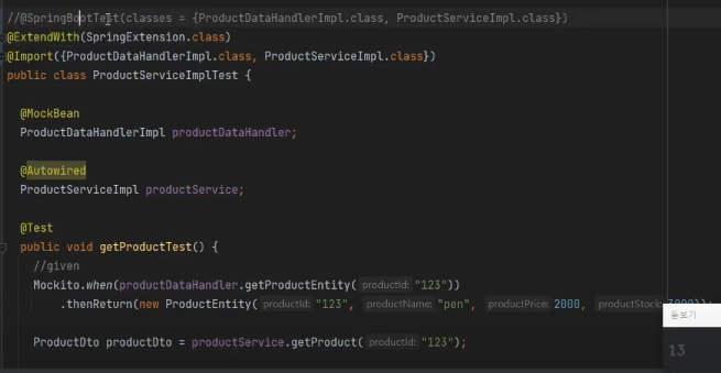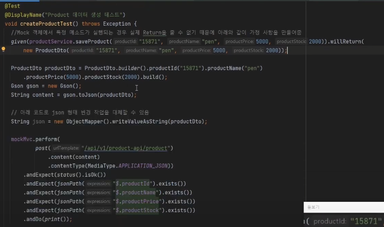 -> 따라서 코드에서보면 getProduct.willlReturn의 파라미터에 new ProductDto로 객체를 생성하고있음 - willReturn() : 어떠한 값이 넘어올거야