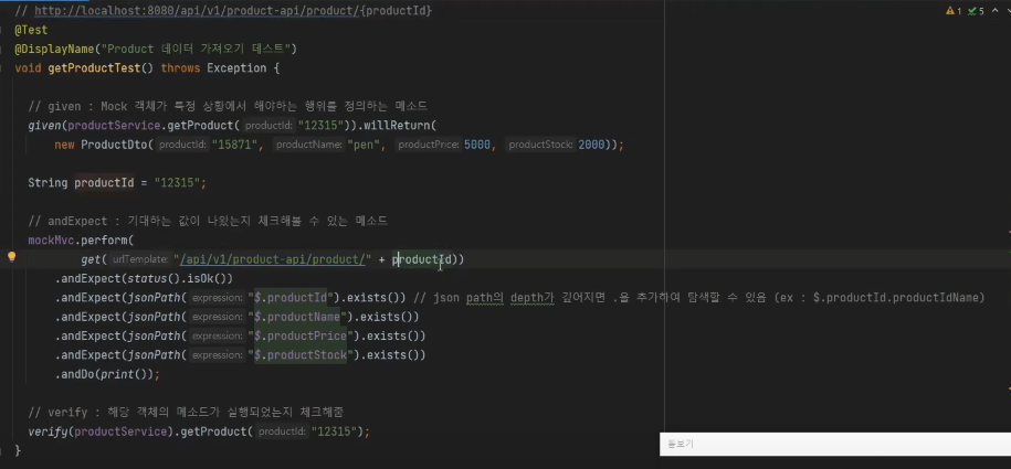 위 코드상에서는 productService라는 객체에서 "12315"로 getProduct가 실행되었는지 체크