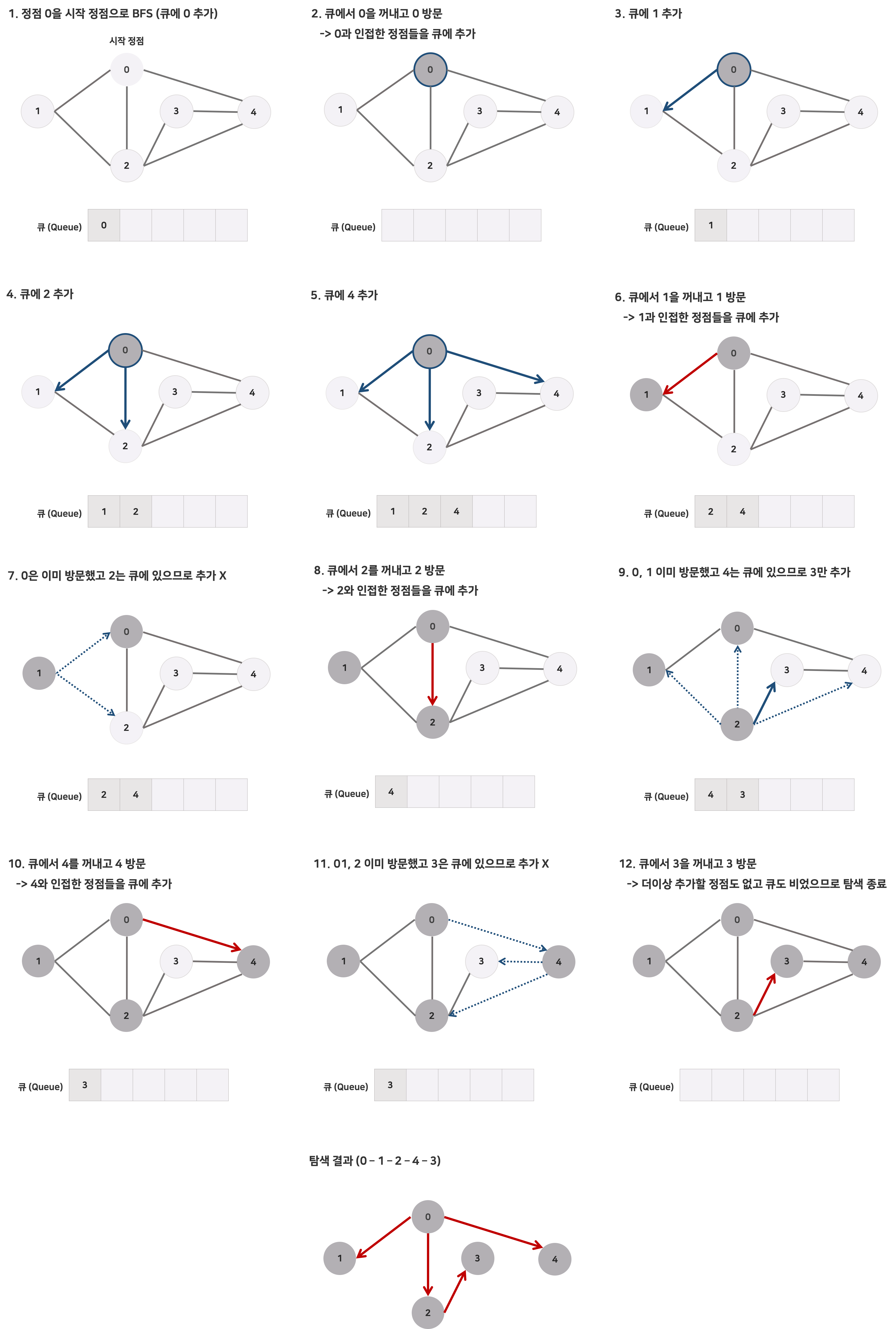 큐가 소진될 때까지 이를 반복하며 BFS를 수행하는 것이다.