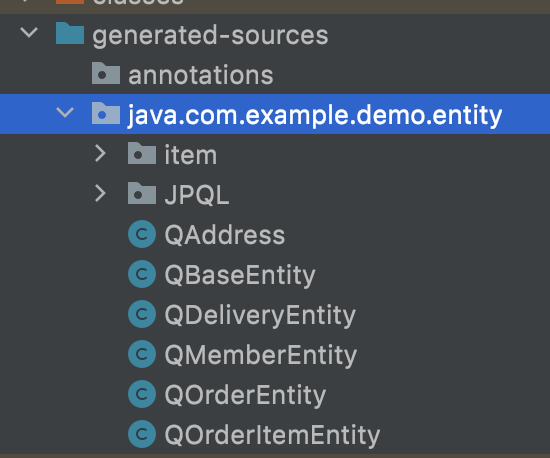 compile이 완료되면 target/generated-sources/java에 생성된 Q class들을 확인할 수 있습니다.