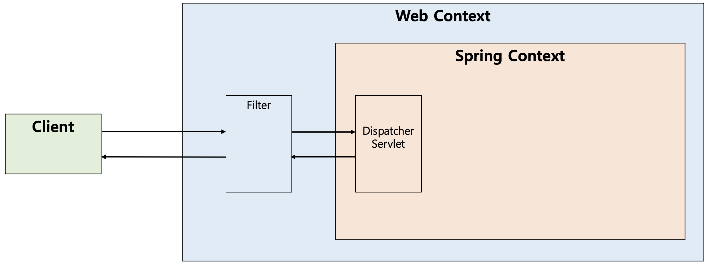 즉, 스프링 컨테이너가 아닌 톰캣과 같은 웹 컨테이너(서블릿 컨테이너)에 의해 관리가 되는 것이고(스프링 빈으로 등록은 된다), 디스패처 서블릿 전/후에 처리하는 것이다. 이러한 과정을 그림으로 표현하면 다음과 같다.