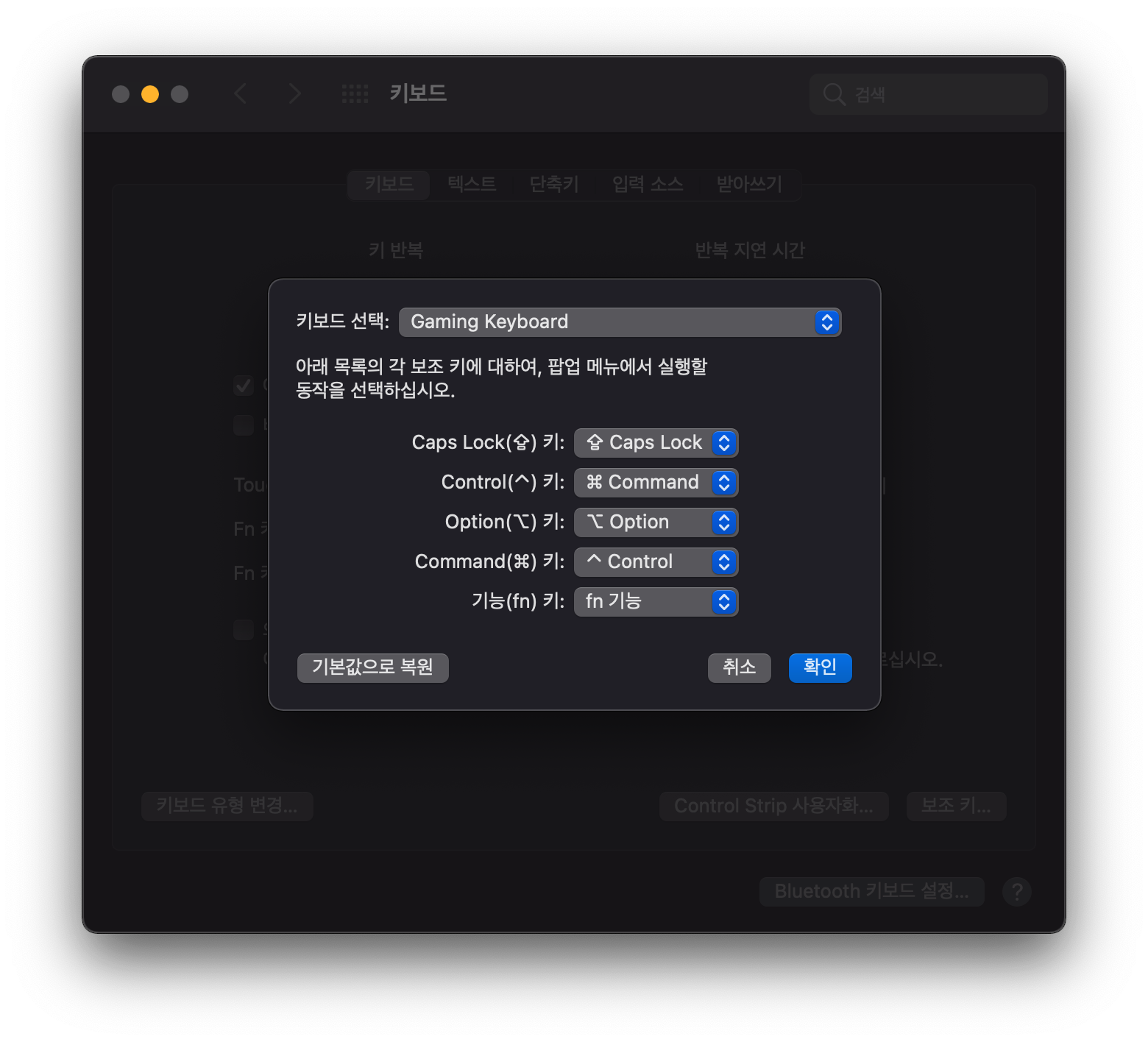 Control 키를 Command로 변경하고, Command키를 Control로 변경하고 '확인'버튼을 누른다.