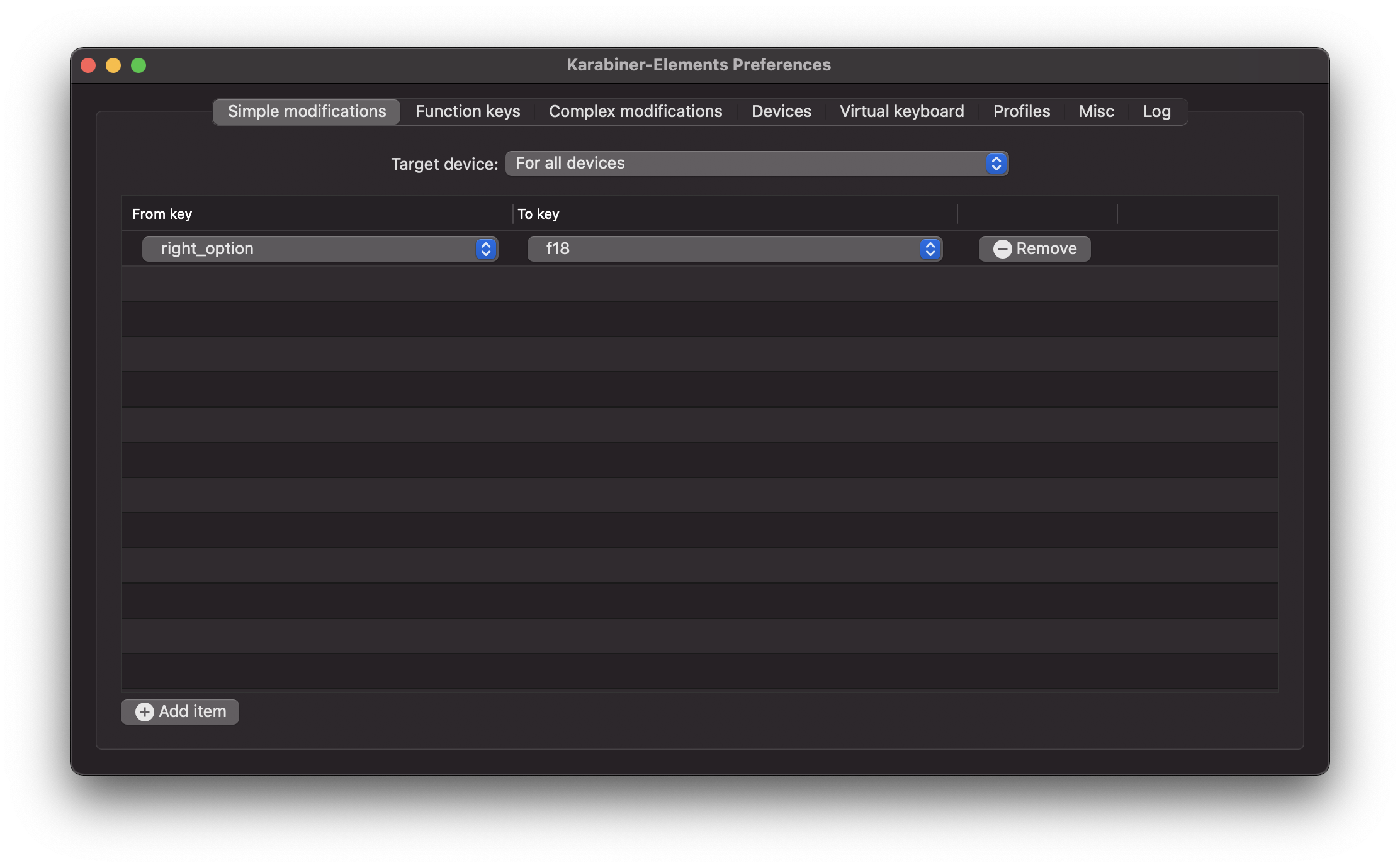 제 키보드는 right_option 키 임으로 이를 실제 존재하지 않는 버튼인 f18로 변경한다.