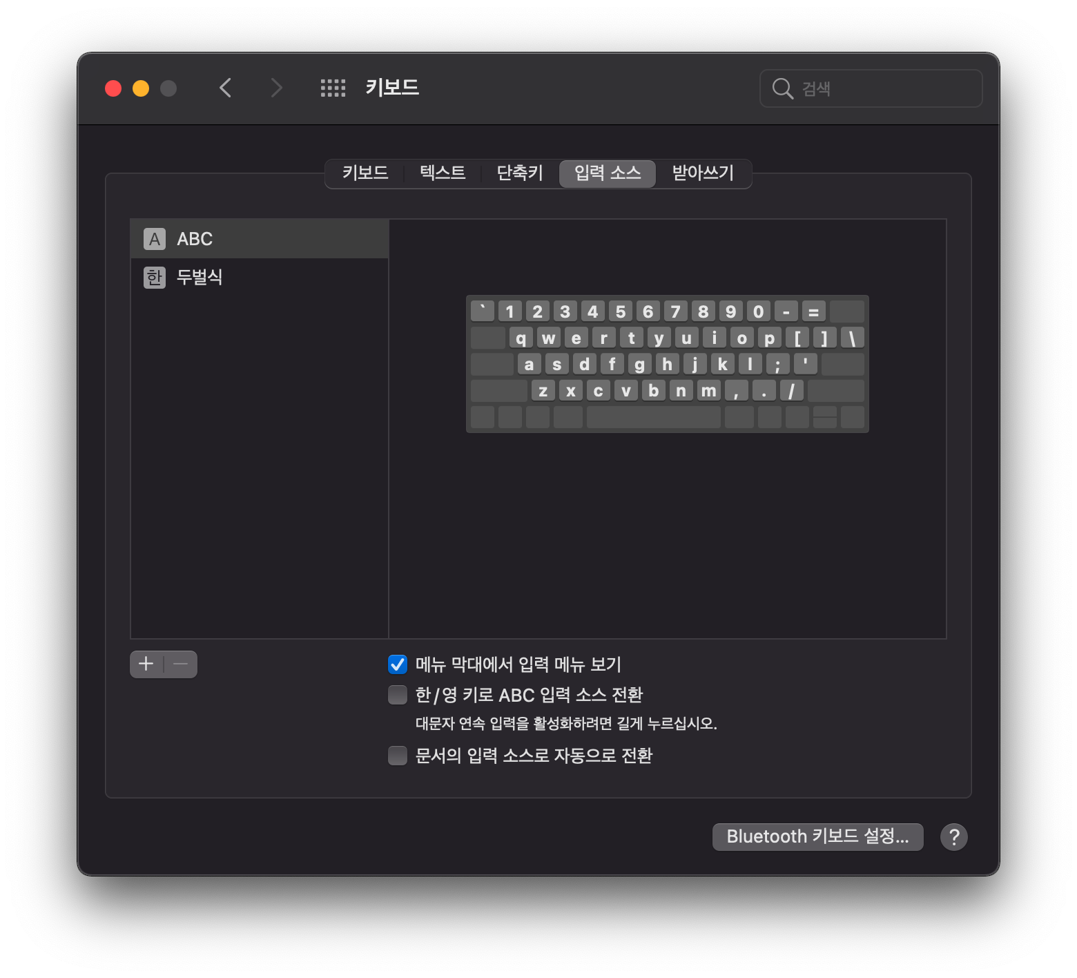 이를 위해 키보드 설정 상단 탭의 '입력소스'를 선택하고, 하단에 위치한 '한/영키로 key ABC 전환'의 체크를 해제한다.
