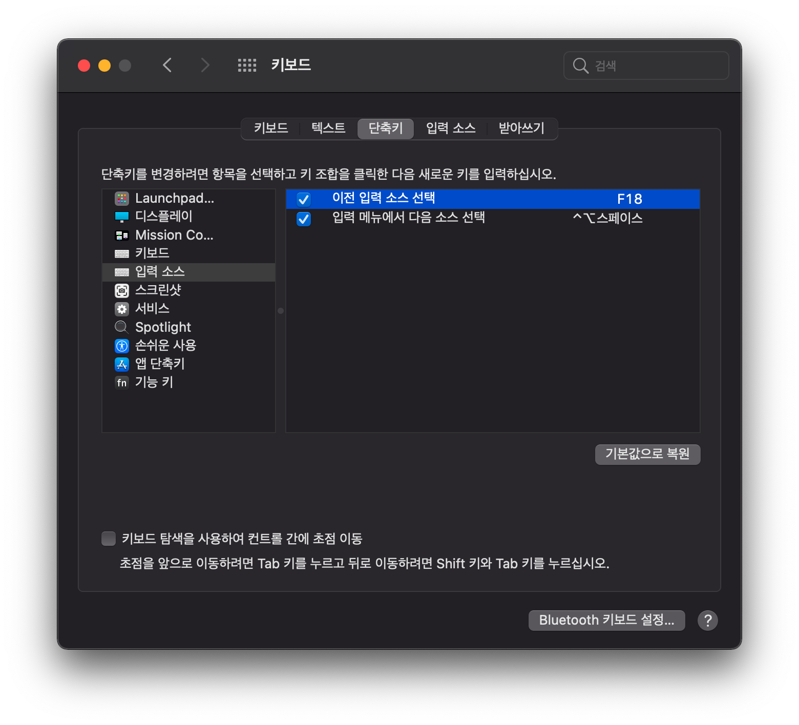 시스템 환경 설정 > 키보드 화면에서 상단탭에서 '단축키'를 선택하고 좌측 메뉴에서 '입력 소스'를 선택하면 아래와 같은 화면을 볼 수 있다. 이 화면에서 '이전 입력 소스 선택'을 바꿔야 한다. 기본 설정은 '^스페이스'로 되어 있다. 이를 Karabiner-Elements 로 설정했던 f18 로 변경해야 한다.