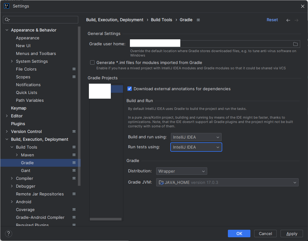 - [File > Settings > Build, Excution, Deployment > Build Tools > Gradle] 이 경로로 이동