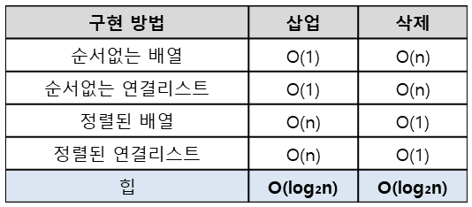우선순위 큐를 힙이 아니라 배열 또는 연결리스트를 이용하여 구현할 수도 있다.