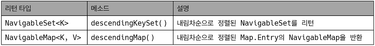 위와같이 NavigableMap은 오름차순과 내림차순으로 번갈하며 정렬 순서를 바꾸는 descendingMap() 메소드를 제공한다.