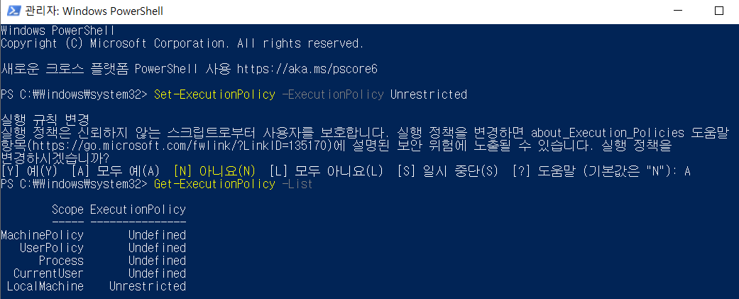 window power shell 을 관리자권한으로 실행해서