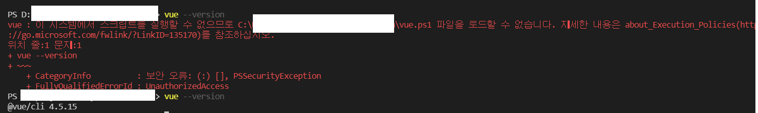 윈도우 환경에서 VUE 프로젝트를 생성시 혹은 VUE 버전을 확인 할 때