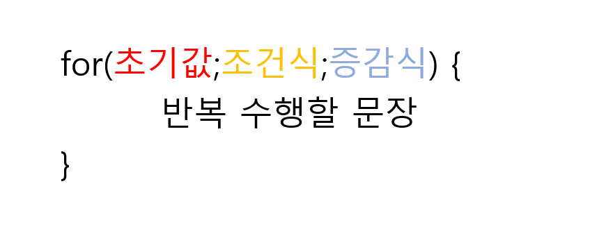 for(inti=1;i<=5;i++) { // 반복 수행할 문장 } 1)초기값: 반복문에 사용될 변수를 초기화하며 처음 한번만 수행, 둘 이상의 변수 선언 가능 (타입이 같아야 함) ex) for(int i=1, j=0; i<=5; i++) { ... } 2)조건식: 조건식의 값이 참(true)이면 반복을 계속하고, 거짓(false)이면 반복을 중단하고 for문을 벗어남 3)증감식: 반복문을 제어하는 변수이 값을 증가 또는 감소시킴