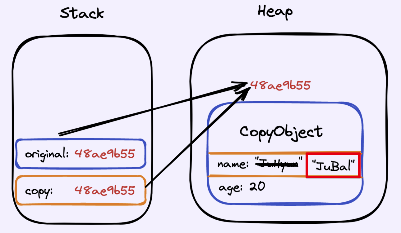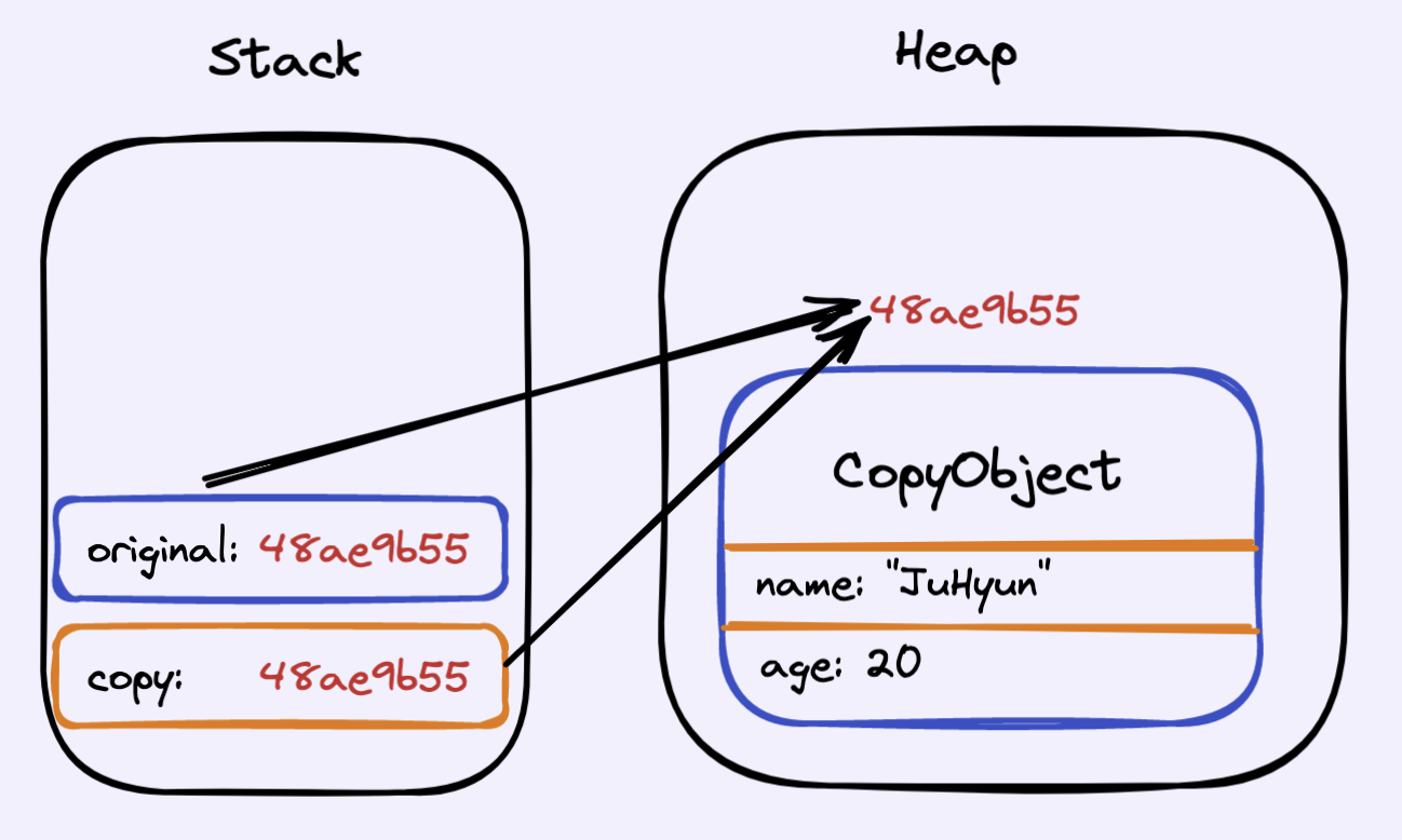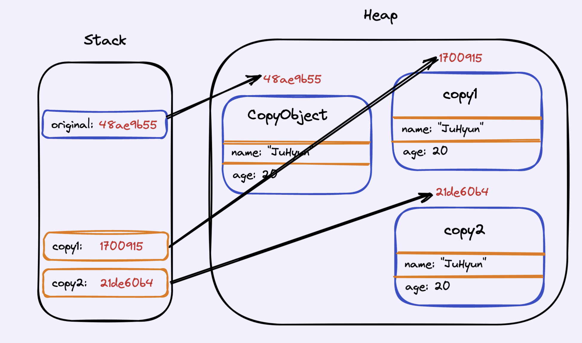 얕은 복사와는 다르게 Heap 영역에 새로운 메모리 공간을 생성하여 실제 값을 복사합니다.