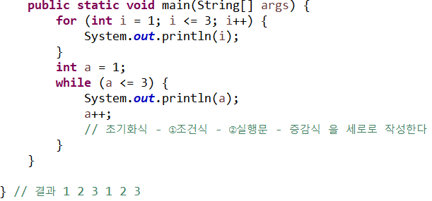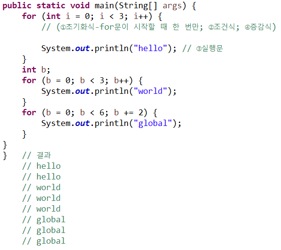 초기화 식 i = 0; 이 제일 먼저 실행된다 → 조건식 i <= 100; 을 평가해서 → 실행문 System.out.println(i); 실행 → 증감식 i++ 가 실행되어 → 결과 : 0~100까지의 값이 출력 된다.