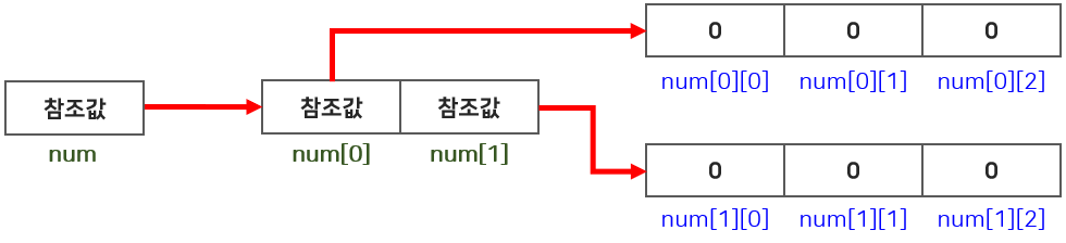 int[ ][ ] num; // 2차원 배열에 대한 레퍼런스 변수 선언