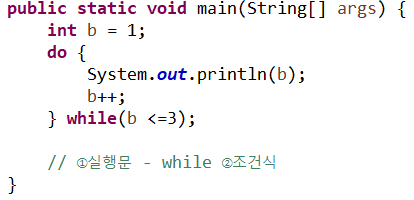 무조건 중괄호 { } 블록을 한 번 실행한 후, 조건 검사해 반복 결정한다.