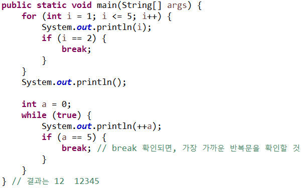 대개 if 문과 같이 사용한다. (if 문 조건식에 따라 for 문과 while 문 종료할 때 사용한다.) break; 문이 가장 가까운 반복문을 만나 결과는 위와 같다.
