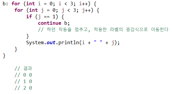 for 문, while 문, do-while 문에서 사용한다. (for 문: 증감식으로 이동 / while, do-while 문: 조건식으로 이동)