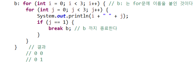 바깥쪽 반복문까지 종료시키려면 반복문에 이름(라벨)을 붙이고, "break 이름;" 사용 해야 한다.