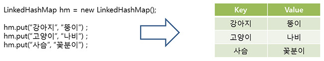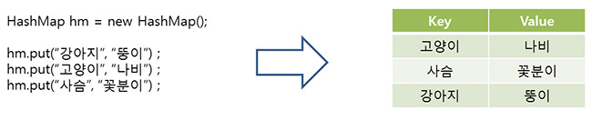 | HashMap hm = new HashMap(); hm.put("강아지", "뚱이"); hm.put("고양이", "나비"); |