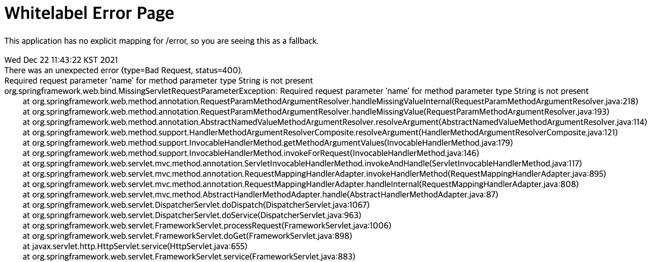 - 위와 같은 log와 함께 Error page가 나오는 것을 확인할 수 있다. 쉽게 말해 name parameter에 아무것도 넘겨주지 않아서 뜨는 에러라고 할 수 있다.